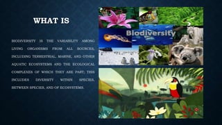 The document discusses terrestrial biodiversity as essential for ecosystem health and human well-being, emphasizing its role in maintaining ecological balance and supporting sustainable development. It highlights threats to biodiversity, including climate change, urbanization, and deforestation, while proposing strategies for conservation and compliance with United Nations goals. Personal responsibility and lifestyle changes are encouraged to protect biodiversity for future generations.