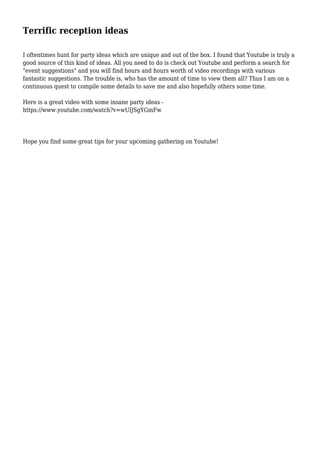 The document discusses the search for unique and out-of-the-box party ideas, highlighting YouTube as a valuable resource. It suggests that users can find extensive video content by searching for 'event suggestions' but acknowledges the challenge of time management. The author aims to compile information to help others save time and shares a specific video with notable party ideas.