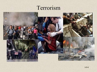 The document defines terrorism and discusses its various types including nationalist, religious, state-sponsored, left-wing, right-wing, and anarchist terrorism. It also examines the motivation of terrorists, the rise of suicide terrorism, how terrorist organizations function, contemporary terrorist tactics, US counterterrorism policy, and predicts higher levels of terrorist violence utilizing new technologies in the future. The core values of honor, courage, and commitment are seen as important for combating terrorism.
