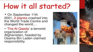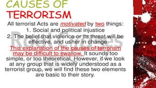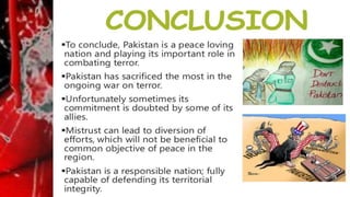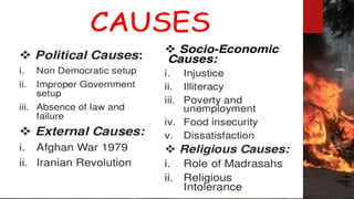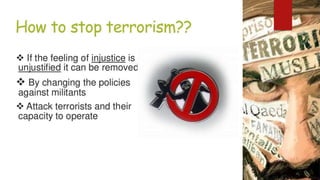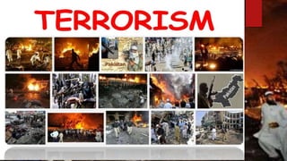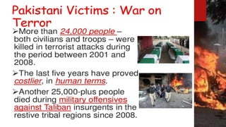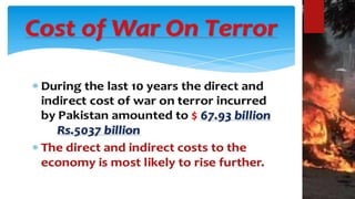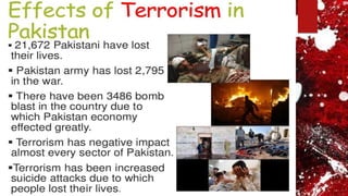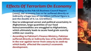 This document discusses the impacts of terrorism on Pakistan. It provides details on the deadly attack on the Army Public School in Peshawar in 2014 where over 140 students were killed. It also mentions how the Pakistan Cricket Board suffered financial losses of $51.22 million after the attack on the Sri Lankan cricket team in Lahore in 2009. The document was presented by three students for their BS program at PUCIT Lahore.