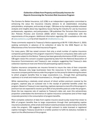 More complete collection of data from captive insurers would surely reveal that closer to 99% of program benefits flow to large corporations through their participating captive insurance subsidiaries, while small and medium sized businesses receive nearly no benefits under the program. CBI suggests that through outreach to state licensed or registered captive managers Treasury would be in a better position to fulfill its statutory mandate to report on the effectiveness of the program.