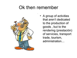 - Different types of services classified according to their role in society, such as social, administrative, financial, cultural, and personal services.
