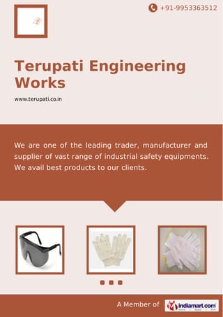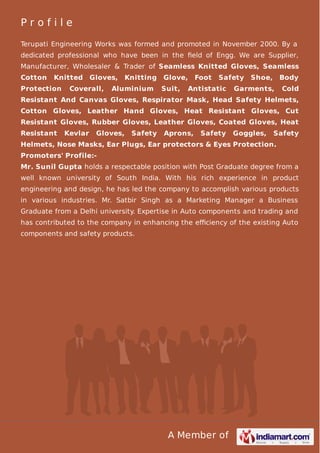 Terupati Engineering Works is an Indian company established in 2000 that manufactures and supplies a wide range of industrial safety equipment such as gloves, protective suits, glasses, ear plugs, and helmets. The company is led by Sunil Gupta and Satbir Singh and has up to 10 employees. Terupati Engineering Works operates out of Gurgaon, Haryana, India and specializes in products like knitted gloves, protective suits, and safety glasses.