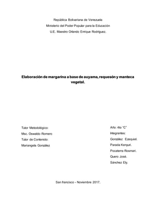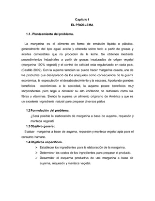Este documento presenta un proyecto de investigación para evaluar la elaboración de una margarina a base de auyama, requesón y manteca vegetal. El problema planteado es si es posible hacer esta margarina. Los objetivos son establecer los ingredientes, determinar los costos y desarrollar el esquema productivo. La justificación es que este producto podría minimizar los costos y brindar un alimento de calidad. La investigación se llevará a cabo en el año escolar 2017-2018 en una unidad educativa en San Francisco, Zulia