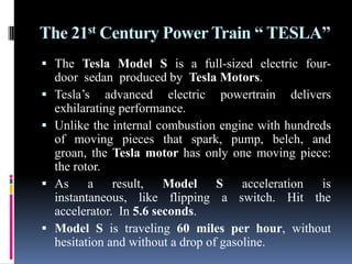 The seminar discussed the Tesla Model S electric sedan. It has a powerful electric powertrain with instant acceleration and no gasoline. The Model S offers different battery options that provide unprecedented driving ranges of up to 270 miles per charge. It can charge quickly using Tesla Superchargers or standard outlets. The Model S prioritizes performance, safety, and luxury, earning numerous awards for its innovative electric vehicle technology.