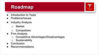This document provides an overview of Tesla Motors including its mission, vision, vehicles, and strategy. It discusses Tesla's goal of making electric vehicles (EVs) a viable alternative to gas-powered cars. The document also analyzes Tesla's position in the automotive industry including competitors and factors impacting growth. It identifies Tesla's technological advantages but also challenges related to costs, production delays, and limited charging infrastructure. Recommendations are made to expand Tesla's network of superchargers and service centers while maintaining responsible technology development and market share gains.
