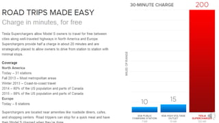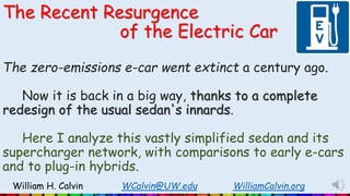 This document summarizes the history and resurgence of electric vehicles. It discusses how electric vehicles were popular in the late 1800s and early 1900s before declining with the rise of gasoline vehicles. It then covers the recent comeback of electric vehicles starting in the late 1990s and 2010s due to advances like Tesla's simplified design which removes many complex parts of traditional gasoline vehicles. The document analyzes Tesla's design and features, including its long range, simplified motor, software updates, charging network and safety. It discusses how electric vehicles can greatly reduce maintenance needs and operating costs compared to gasoline vehicles.