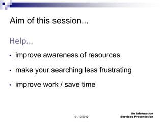 The document provides information about a library induction session for TESOL students, including an overview of resources like books, websites, journals, and databases for topics like linguistics, communication, and language; tips for better database searching using advanced features and expanding searches; and details on specific databases that cover linguistics, language, communication, and the humanities. The presentation aims to improve students' awareness of library resources and make searching less frustrating to improve work and save time.