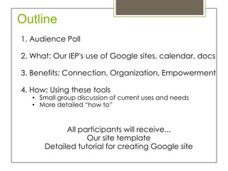 The document outlines a presentation on the use of Google Apps for supervisors and teachers, focusing on tools like Google Sites, Calendar, and Docs. It emphasizes the benefits of improved connection, organization, and empowerment for team collaboration, highlighting the features of a centralized site for communication and resource sharing. Additionally, it discusses the transition to Google Apps and solicits feedback on users' current and future tool needs.