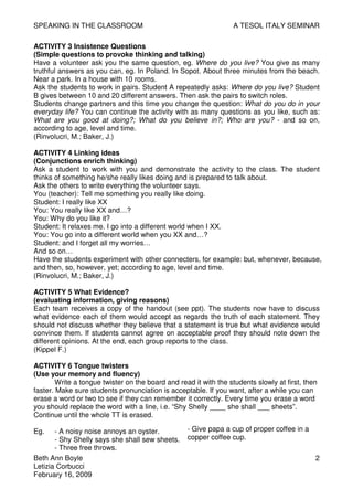 1) The document outlines 10 speaking activities for an English language classroom including discussions, role plays, guessing games, and tongue twisters. 2) It also includes instructions for completing the activities in groups or pairs and evaluating student performance based on accuracy or fluency. 3) Resources for additional activities and rubrics for assessment are provided.