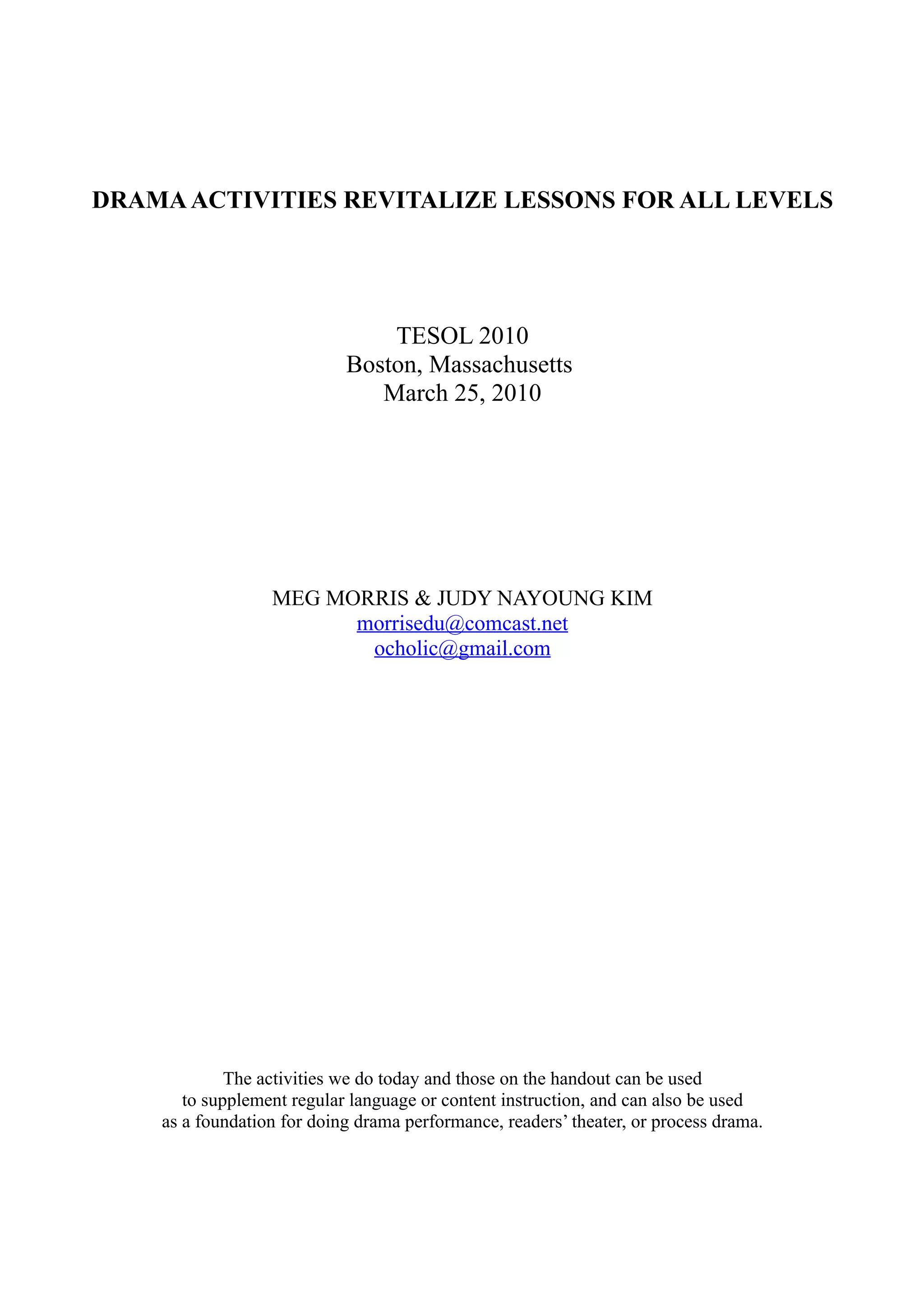 This document provides guidance on using drama activities to supplement language and content instruction for students of all levels. It describes several drama activities that can help students improve fluency, confidence, and interpersonal skills. Some activities involve partners finding things in common, throwing an invisible ball, acting as trees and birds, and creating instant stories. The document discusses benefits for both teachers and students, such as addressing different learning styles, collaboration, and enjoyment. It provides tips for how teachers can start incorporating these activities, such as focusing on specific skills and connecting activities to curriculum.