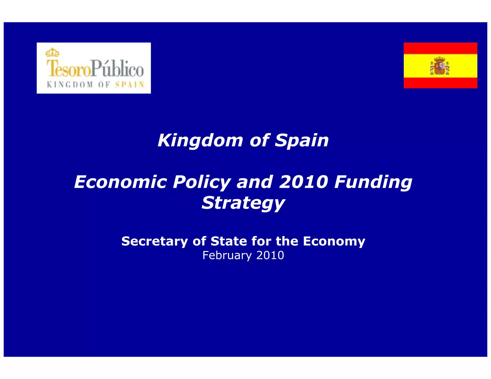 The document outlines Spain's economic policy and 2010 funding strategy. It highlights the long growth cycle prior to the international crisis and the important challenges of unemployment and deficit that resulted. The government is committed to fiscal consolidation through a 5.7% cut in the structural deficit by 2013 and structural reforms to boost potential GDP through a sustainable economy, bank reorganization, pensions, and labor market reforms. The funding strategy focuses on reducing spending and moderately increasing revenues to cut the structural deficit by 2.2% in 2010.