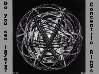 This document provides biographical information about the artist M.C. Escher and discusses his artworks and style. It notes that Escher was born in 1898 in the Netherlands and died in 1972. Although he disliked formal schooling, he enjoyed geometry and art. The document then discusses Escher's tessellations and how he was a master of geometric designs that play with dimensions and perspective in thought-provoking ways. It provides some basics on tessellation techniques using translation, rotation, and reflection of basic shapes.