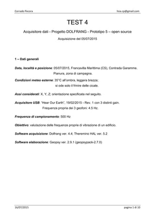 Il documento descrive un progetto per la valutazione delle frequenze di vibrazione di un edificio in muratura situato a Francavilla Marittima. Viene presentato l'analisi dinamica dell'edificio utilizzando software specifici e dettagli sulle caratteristiche strutturali, inclusi i materiali e le dimensioni. I risultati dell'analisi indicano i modi di vibrazione principali con le relative frequenze e partecipazioni della massa.