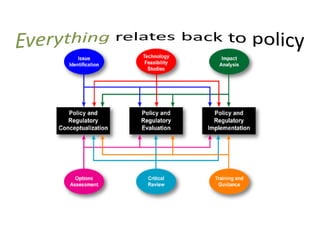 The document discusses the history and development of environmental policy over time, from the initial lack of regulations in the past to the modern environmental movement and various policies enacted by governments at all levels to address issues like pollution, endangered species, and more. It also examines the various stakeholders that influence policy, including government, citizens, science, and non-governmental organizations, and how environmental issues rise on the policy agenda through public awareness. Overall it traces the progress that has been made but notes there is still work to be done to fully address environmental problems.