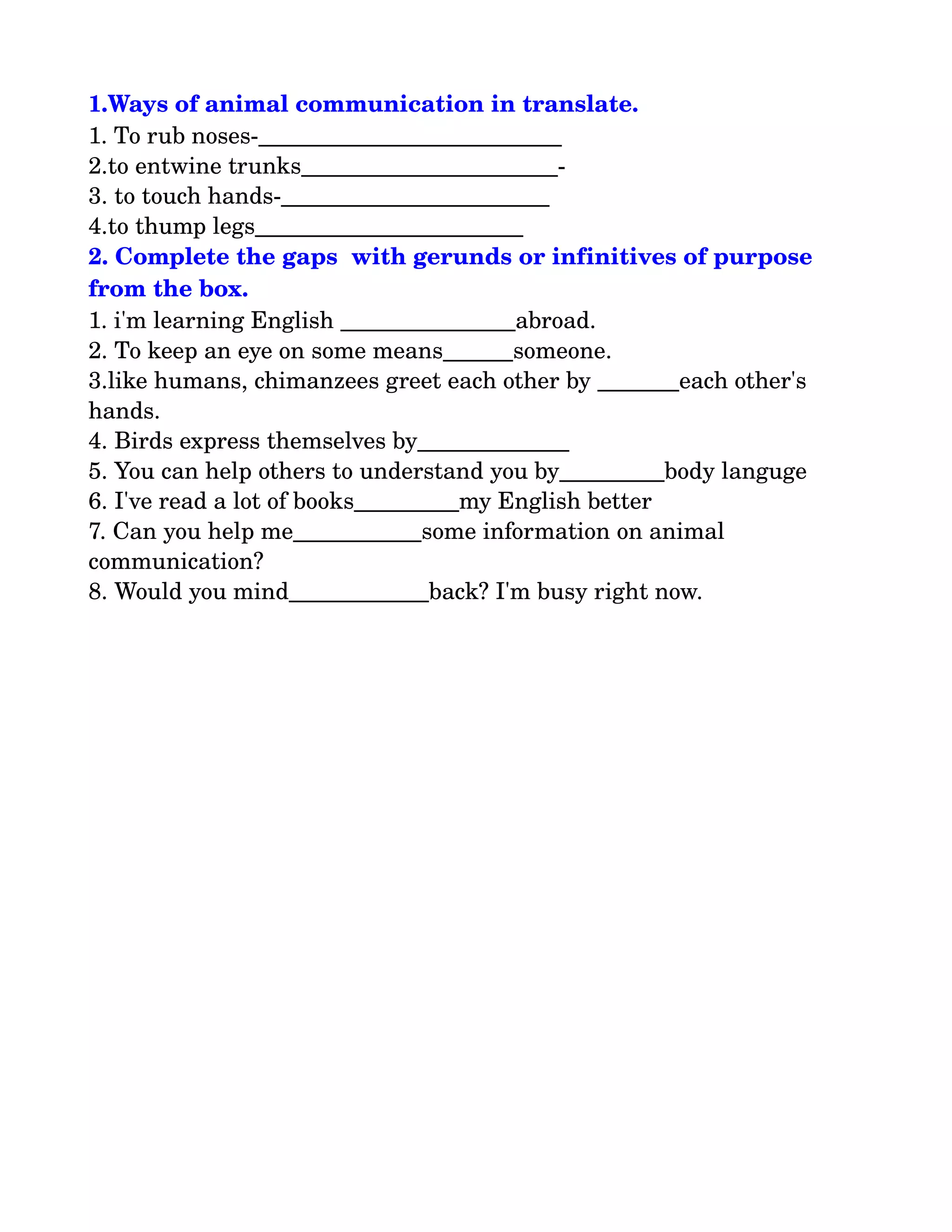 This document discusses ways that animals communicate and completes sentences with gerunds or infinitives of purpose related to communication. It begins by listing forms of communication for animals, such as rubbing noses or touching hands. It then provides a gap fill exercise where the blanks are filled with terms like "learning, keeping, touching, expressing, using, improving, finding, calling" to discuss communicating for purposes like greeting, expressing oneself, understanding others, improving a language skill, obtaining information, or getting someone's attention. The overall document focuses on examples and exercises related to animal communication and using language to communicate for different intentions.