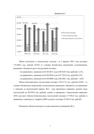Аналитическая записка представлена коллегией контрольно-счетной палаты города Апатиты и содержит мониторинг исполнения городского бюджета за I квартал и полугодие 2012 года. Документ включает сравнение доходов и расходов бюджета с аналогичными периодами трех лет, фиксируя рост неналоговых доходов, а также снижение доли налоговых поступлений. В заключении представлены итоги исполнения бюджета и анализ изменений в структуре доходов.