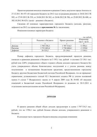 Документ содержит заключение контрольно-счетной палаты города Апатиты о внесении изменений в городской бюджет на 2012 год, утвержденное коллегией палаты. Основные изменения касаются объема доходов и расходов, где доходы увеличиваются на 1 956,1 тыс. рублей, а расходы уменьшаются на 1 239,0 тыс. рублей, что ведет к снижению дефицита бюджета на 3 195,1 тыс. рублей. В документе также представлены изменения в источниках финансирования и параметры бюджета на различные социальные программы и направления.