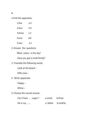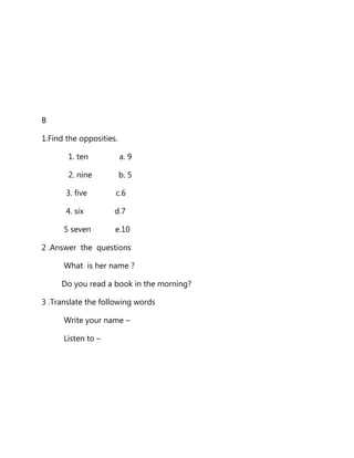 The document provides examples of opposites, questions to answer, translations, and choosing correct answers. It contains two sections, A and B. Section A includes examples of finding opposites such as matching five with 3, four with 2, and three with 1. It also asks questions about the color of the sky and family size. Section A provides translations and asks to write opposites and choose the correct answer between some and three or father and mother. Section B follows a similar format with finding opposites such as matching ten with 9, nine with 5, five with 6, six with 7, and seven with 10. It asks questions about a name and reading habits and provides translations for writing a name and listening.