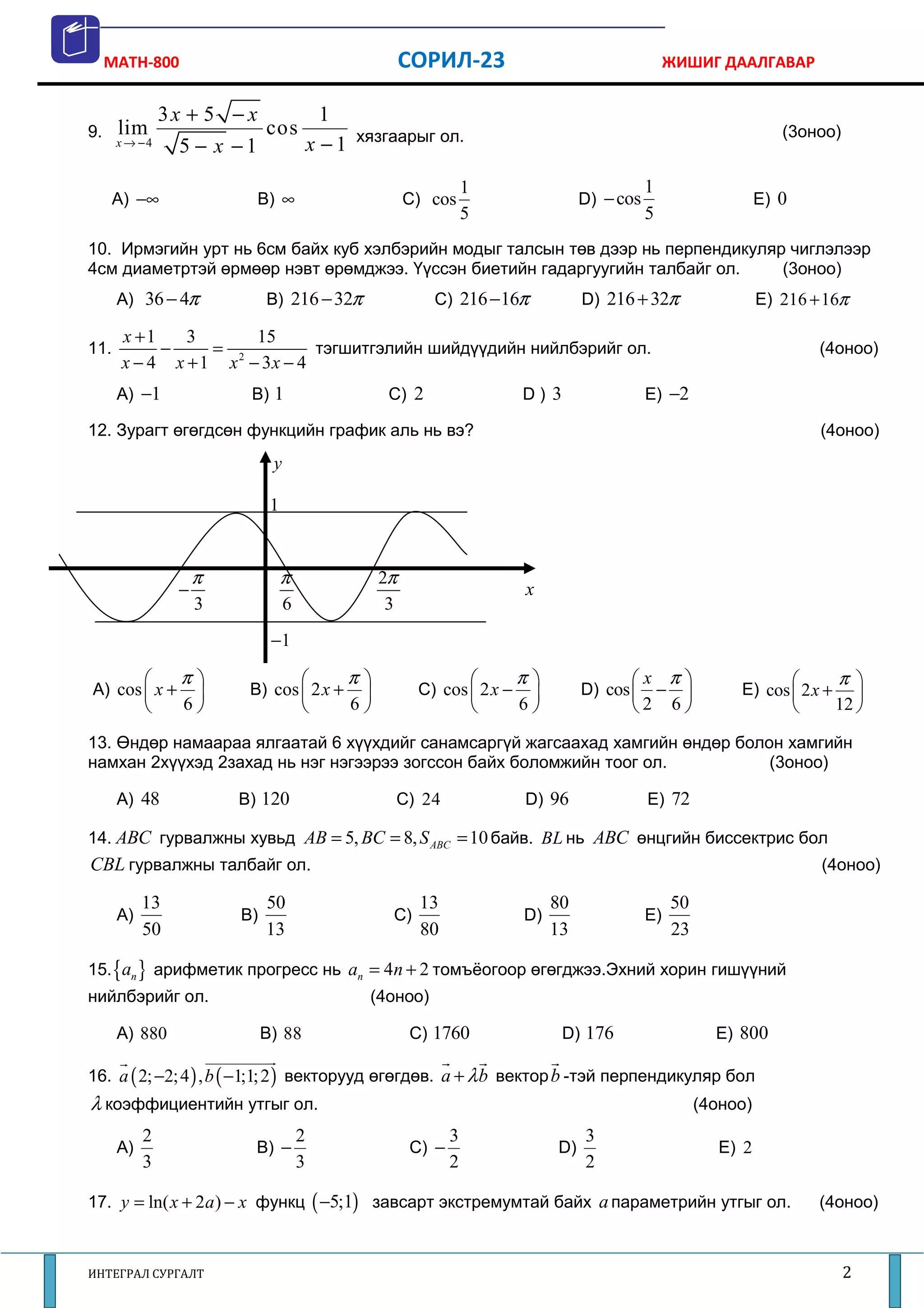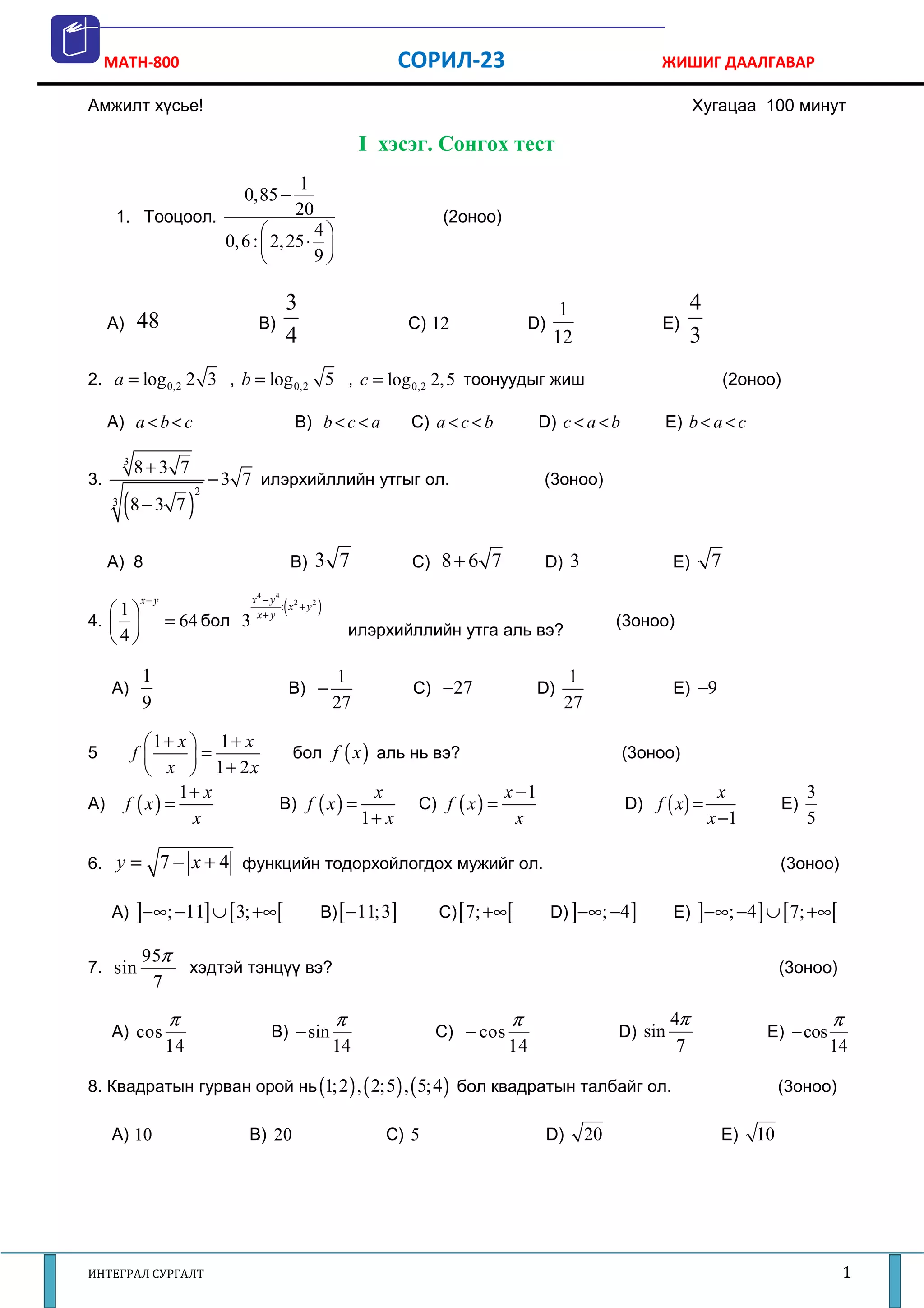 MATH-800 СОРИЛ-23 ЖИШИГ ДААЛГАВАР