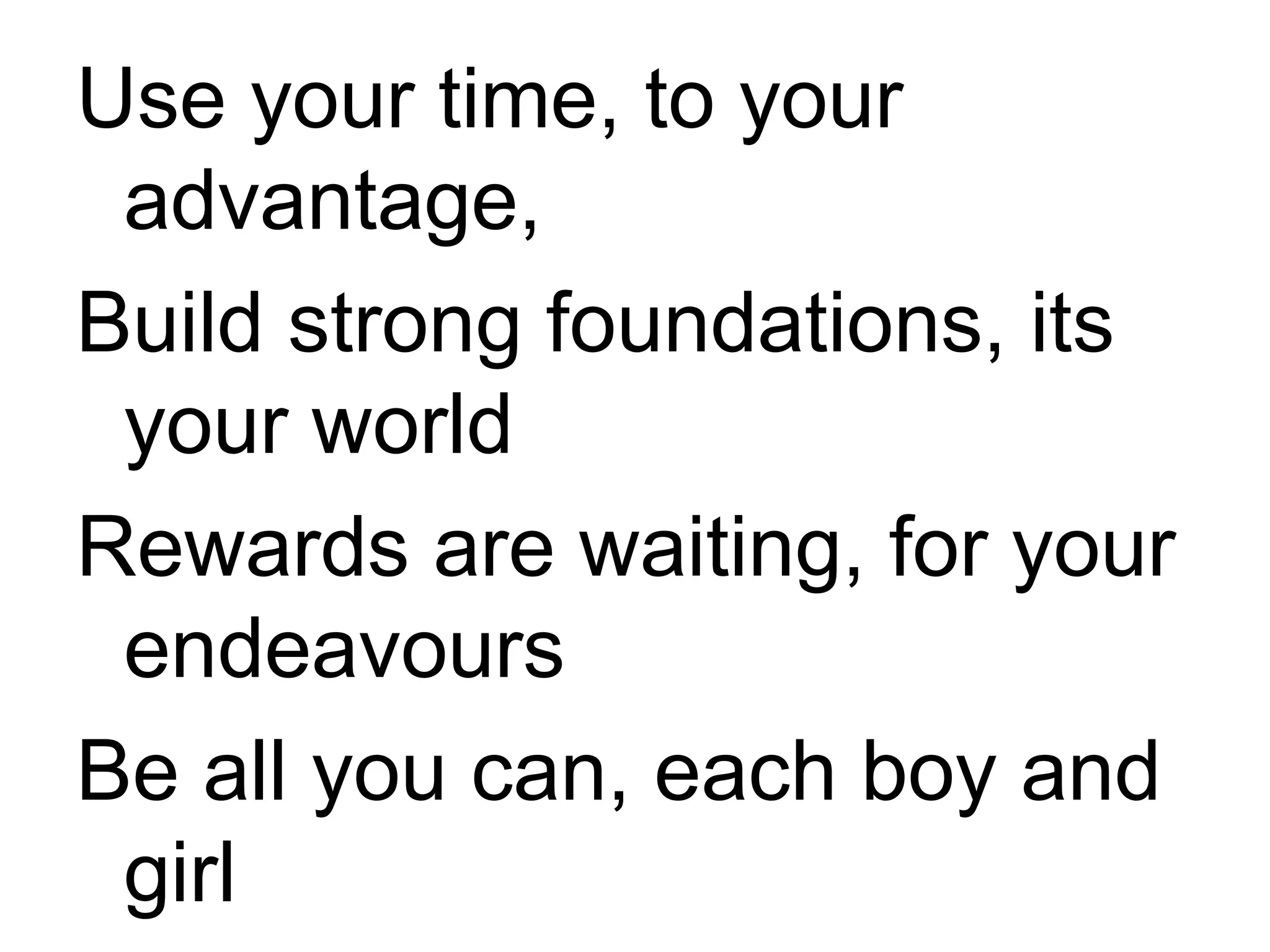 The document encourages using time wisely to build strong foundations and pursue endeavors, as nothing great comes easily and tomorrow may be too late. It advises choosing your own path, taking steps forward toward goals, and valuing each moment at school to make the most of time, which waits for no one.