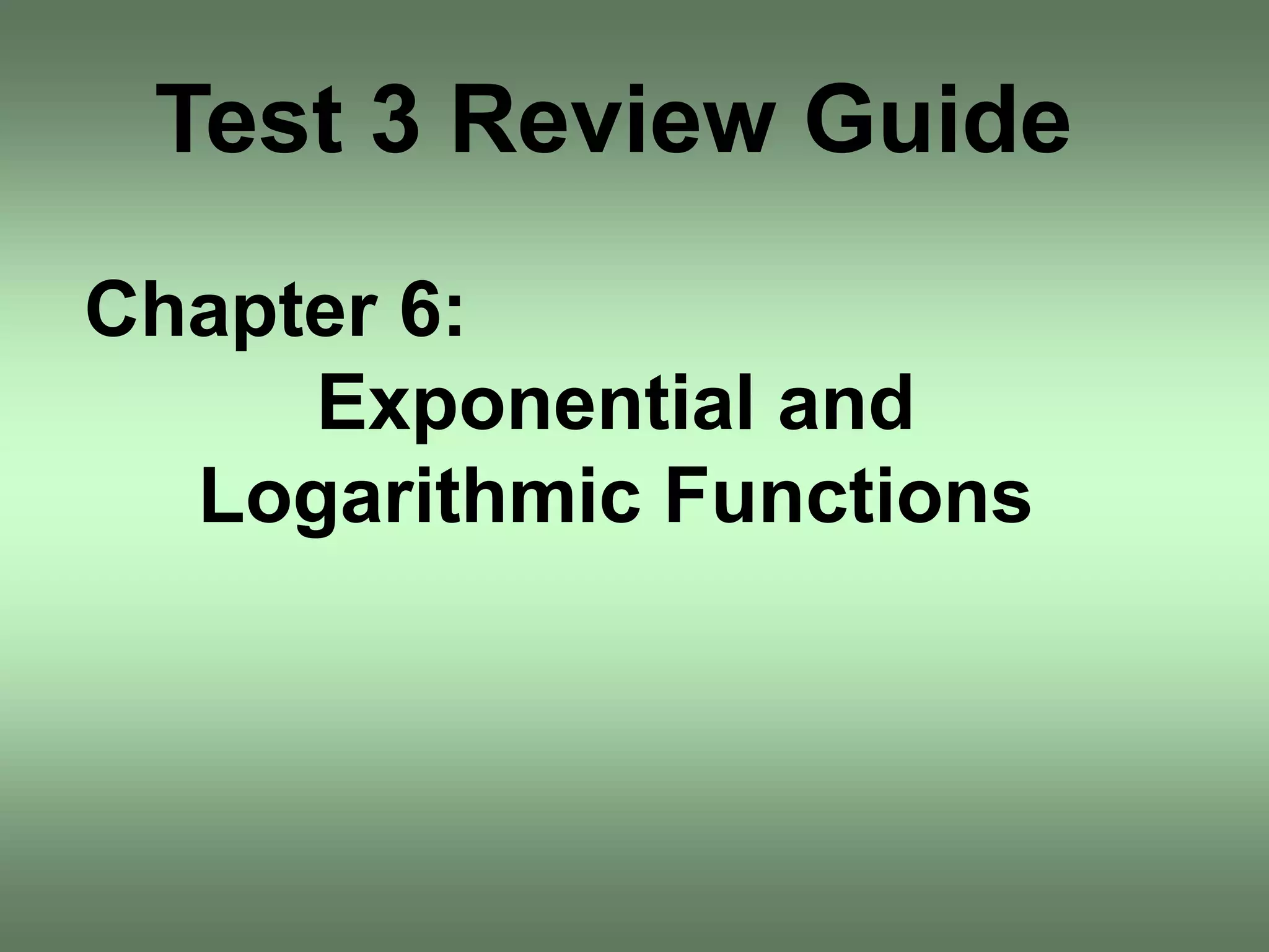 3) Using properties of logarithms to evaluate expressions, write logarithmic expressions in different forms, and change between exponential and logarithmic expressions.