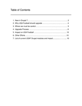 The document discusses upgrading USA Football's Drupal site from version 6 to version 7. It provides details on the new features in Drupal 7, the benefits of upgrading, and outlines a 19 step process for performing the upgrade. Key impacts of upgrading include a more robust, secure, and performant site that can better handle large amounts of data and easily upgrade to future versions of Drupal. The document also analyzes USA Football's current modules to see which require updates, customization, or replacement to work with Drupal 7.