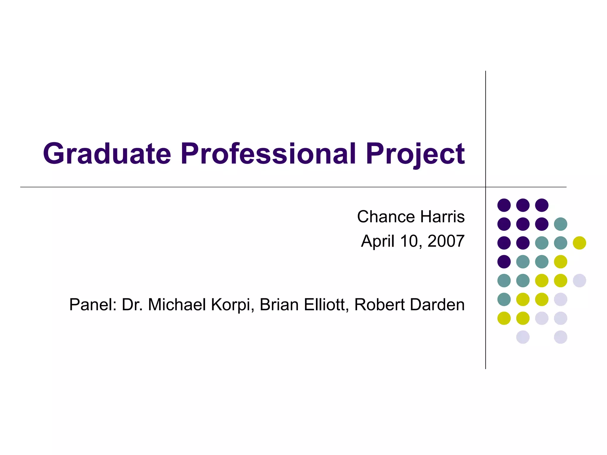 This document provides an overview of a graduate student's professional project to create 3D virtual environments and composite filmed footage of an actor into the virtual scenes. The project involved modeling locations based on a script, lighting test shoots with a green screen, and compositing the footage into the 3D environments using software like Blender, Shake, and Final Cut Pro. Challenges included long render times, matching virtual and practical lighting, and limitations of the green screen setup.