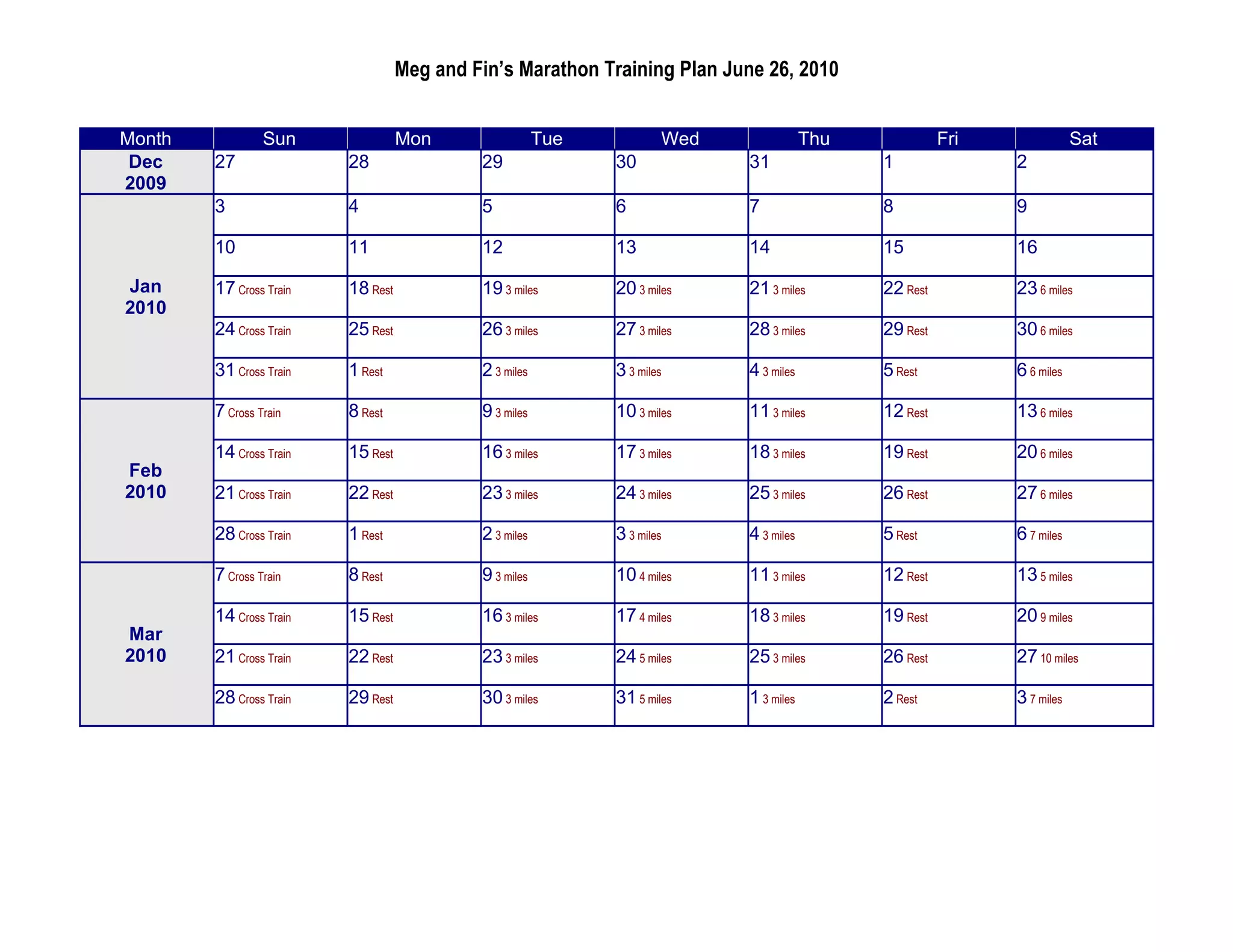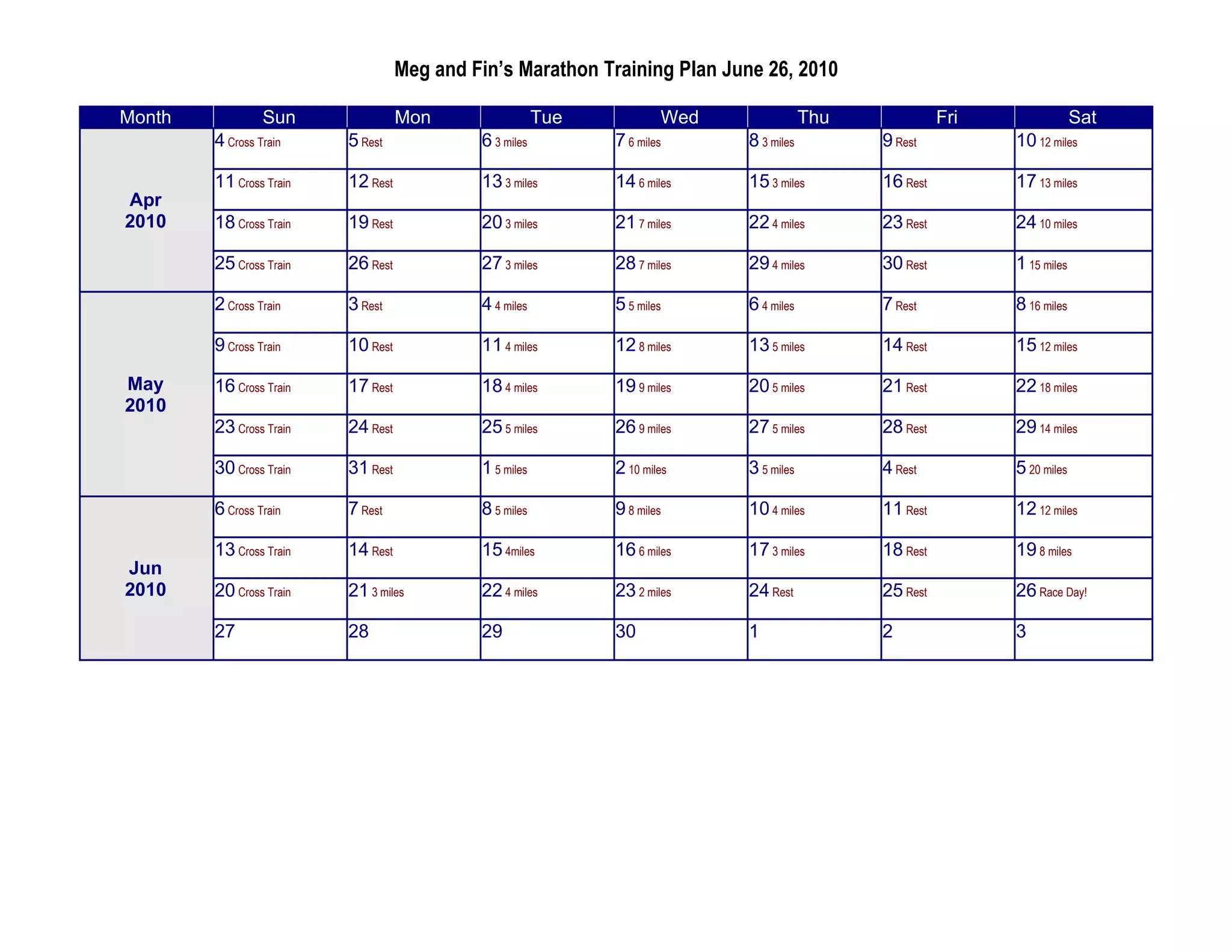 This document outlines Meg and Fin's 18-week marathon training plan, which gradually increases their long run distances from 6 to 20 miles. On Mondays and Fridays they rest, and do cross-training on Sundays. Their runs are 3 miles on Tuesdays and Wednesdays initially, increasing over time. Saturdays are dedicated to their weekly long run, starting at 6 miles and building up. The plan provides structure and progression to prepare them for their marathon in 18 weeks.