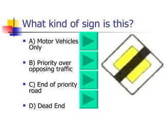 This document contains 4 multiple choice questions about road signs, each with feedback stating whether the answer was correct or not and a prompt to move to the next question. The questions cover signs for motor vehicles only, priority over opposing traffic, end of priority road, motorway, bus station, one way street, parking with meters, priority road, and no motor vehicles. After the 4th question, final feedback thanks the user for playing and encourages them to try again.