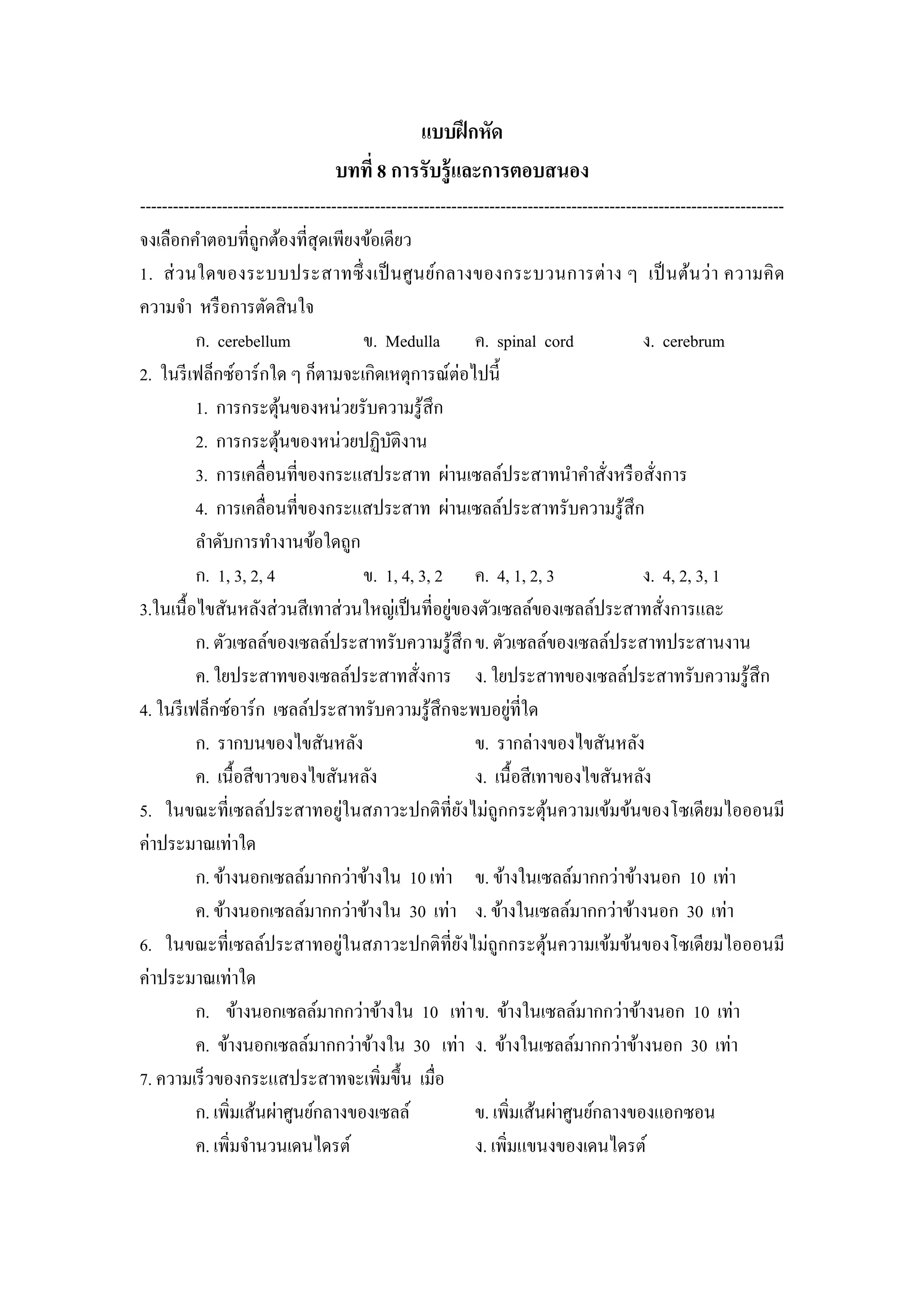 บทที่ 8 การรับรู้ และการตอบสนอง ---------------------------------------------------------------------------------------------------------------------- จงเลือกคําตอบที่ถูกต้องที่สุดเพียงข้อเดียว 1. ส่ ว นใดของระบบประสาทซึ่ ง เป็ นศู น ย์ก ลางของกระบวนการต่ า ง ๆ เป็ นต้น ว่ า ความคิ ด ความจํา หรื อการตัดสิ นใจ ก. cerebellum ข. Medulla ค. spinal cord ง. cerebrum 2. ในรี เฟล็กซ์อาร์กใด ๆ ก็ตามจะเกิดเหตุการณ์ต่อไปนี้ 1. การกระตุนของหน่วยรับความรู ้สึก ้ 2. การกระตุนของหน่วยปฏิบติงาน ้ ั 3. การเคลื่อนที่ของกระแสประสาท ผ่านเซลล์ประสาทนําคําสังหรื อสังการ ่ ่ 4. การเคลื่อนที่ของกระแสประสาท ผ่านเซลล์ประสาทรับความรู ้สึก ลําดับการทํางานข้อใดถูก ก. 1, 3, 2, 4 ข. 1, 4, 3, 2 ค. 4, 1, 2, 3 ง. 4, 2, 3, 1 ่ 3.ในเนื้ อไขสันหลังส่ วนสี เทาส่ วนใหญ่เป็ นที่อยูของตัวเซลล์ของเซลล์ประสาทสังการและ ่ ก. ตัวเซลล์ของเซลล์ประสาทรับความรู ้สึก ข. ตัวเซลล์ของเซลล์ประสาทประสานงาน ค. ใยประสาทของเซลล์ประสาทสังการ ง. ใยประสาทของเซลล์ประสาทรับความรู ้สึก ่ 4. ในรี เฟล็กซ์อาร์ก เซลล์ประสาทรับความรู ้สึกจะพบอยูที่ใด ่ ก. รากบนของไขสันหลัง ข. รากล่างของไขสันหลัง ค. เนื้อสี ขาวของไขสันหลัง ง. เนื้อสี เทาของไขสันหลัง ่ 5. ในขณะที่เซลล์ประสาทอยูในสภาวะปกติที่ยงไม่ถูกกระตุนความเข้มข้นของโซเดียมไอออนมี ั ้ ค่าประมาณเท่าใด ก. ข้างนอกเซลล์มากกว่าข้างใน 10 เท่า ข. ข้างในเซลล์มากกว่าข้างนอก 10 เท่า ค. ข้างนอกเซลล์มากกว่าข้างใน 30 เท่า ง. ข้างในเซลล์มากกว่าข้างนอก 30 เท่า ่ 6. ในขณะที่เซลล์ประสาทอยูในสภาวะปกติที่ยงไม่ถูกกระตุนความเข้มข้นของโซเดียมไอออนมี ั ้ ค่าประมาณเท่าใด ก. ข้างนอกเซลล์มากกว่าข้างใน 10 เท่า ข. ข้างในเซลล์มากกว่าข้างนอก 10 เท่า ค. ข้างนอกเซลล์มากกว่าข้างใน 30 เท่า ง. ข้างในเซลล์มากกว่าข้างนอก 30 เท่า 7. ความเร็ วของกระแสประสาทจะเพิ่มขึ้น เมื่อ ก. เพิ่มเส้นผ่าศูนย์กลางของเซลล์ ข. เพิ่มเส้นผ่าศูนย์กลางของแอกซอน ค. เพิ่มจํานวนเดนไดรต์ ง. เพิ่มแขนงของเดนไดรต์