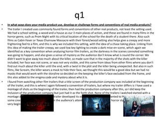 The media student discusses how their horror film trailer uses and develops conventions of real trailers while also challenging some conventions. The trailer uses common horror settings like schools and forests. It keeps the killer's face hidden, includes ominous music and handheld camerawork during chase scenes. However, the student begins with a montage rather than just the production company. The killer is also a female, challenging the male killer convention. The magazine cover follows conventions like positioning but challenges expectations by featuring a powerful female killer rather than a victim. The poster features an unusual reflective shot of the main character but includes standard elements like the title and tagline positioned conventionally.