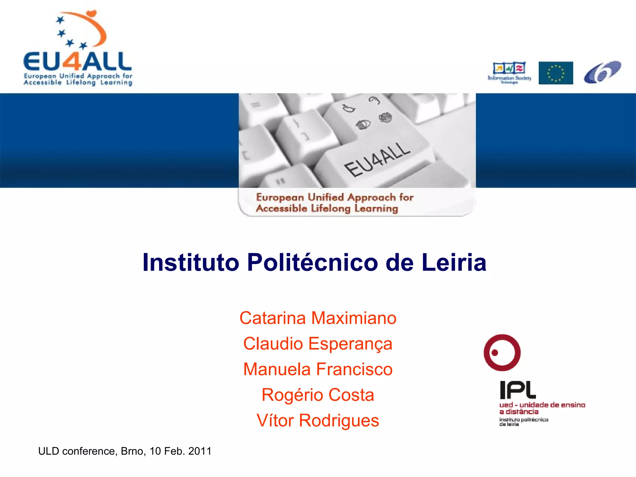 The document summarizes the implementation of universal learning design (ULD) components at Instituto Politécnico de Leiria in Portugal. It describes the EU4ALL plugin and course activity components developed to integrate courses with the EU4ALL metadata repository and provide personalized accessible content. It also outlines a pilot course implemented with the components, which included course materials in multiple formats to accommodate users with various disabilities.