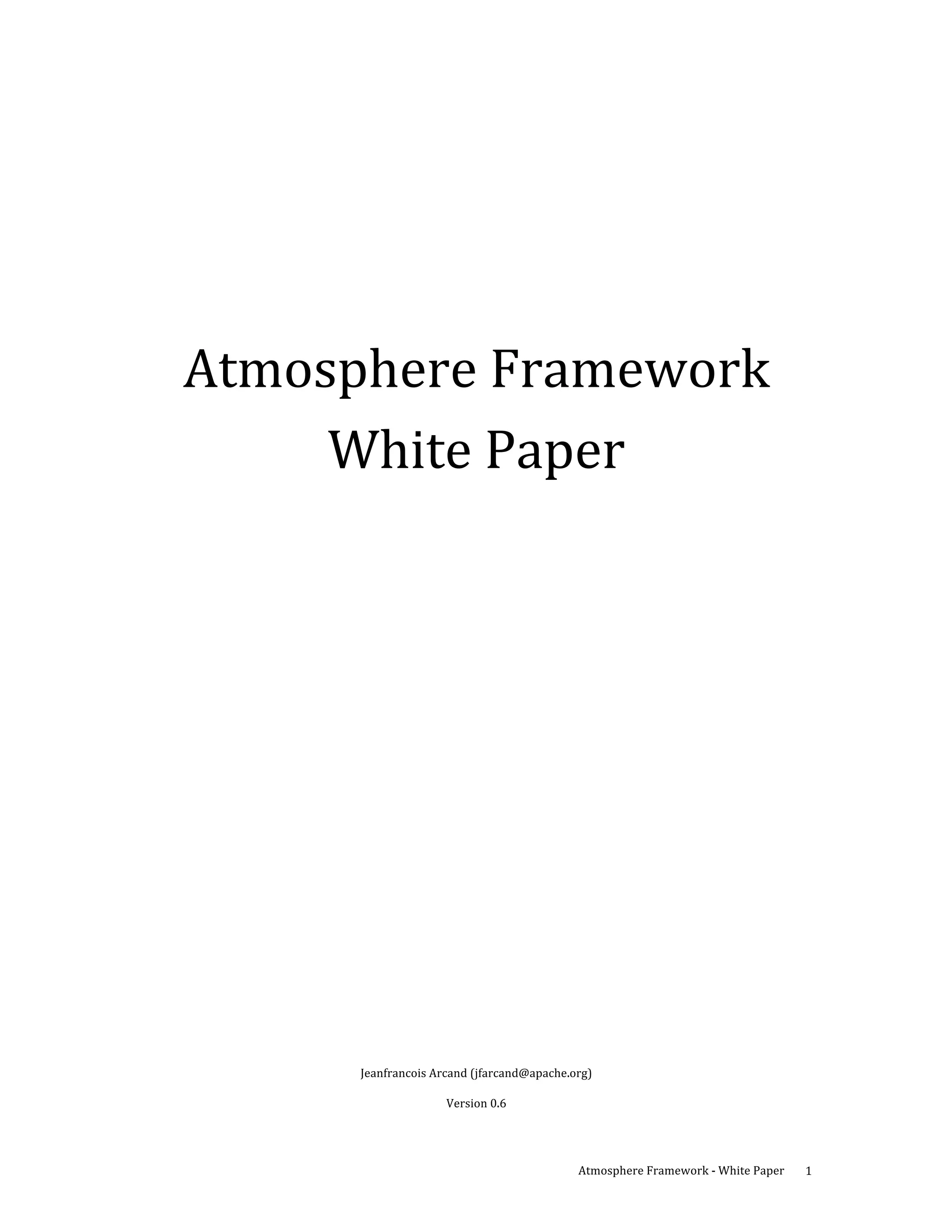 This document introduces the Atmosphere Framework, which is designed to make it easier to build asynchronous/Comet-based web applications. It describes the main modules of the framework - Atmosphere Runtime, Annotations, Jersey, and Meteor. It also covers plug-ins, the Spade Server, and supported web servers. The document provides an overview of key Atmosphere concepts like suspend, resume, and broadcast. It recommends a standard WAR file structure and context.xml file for portability across web servers.