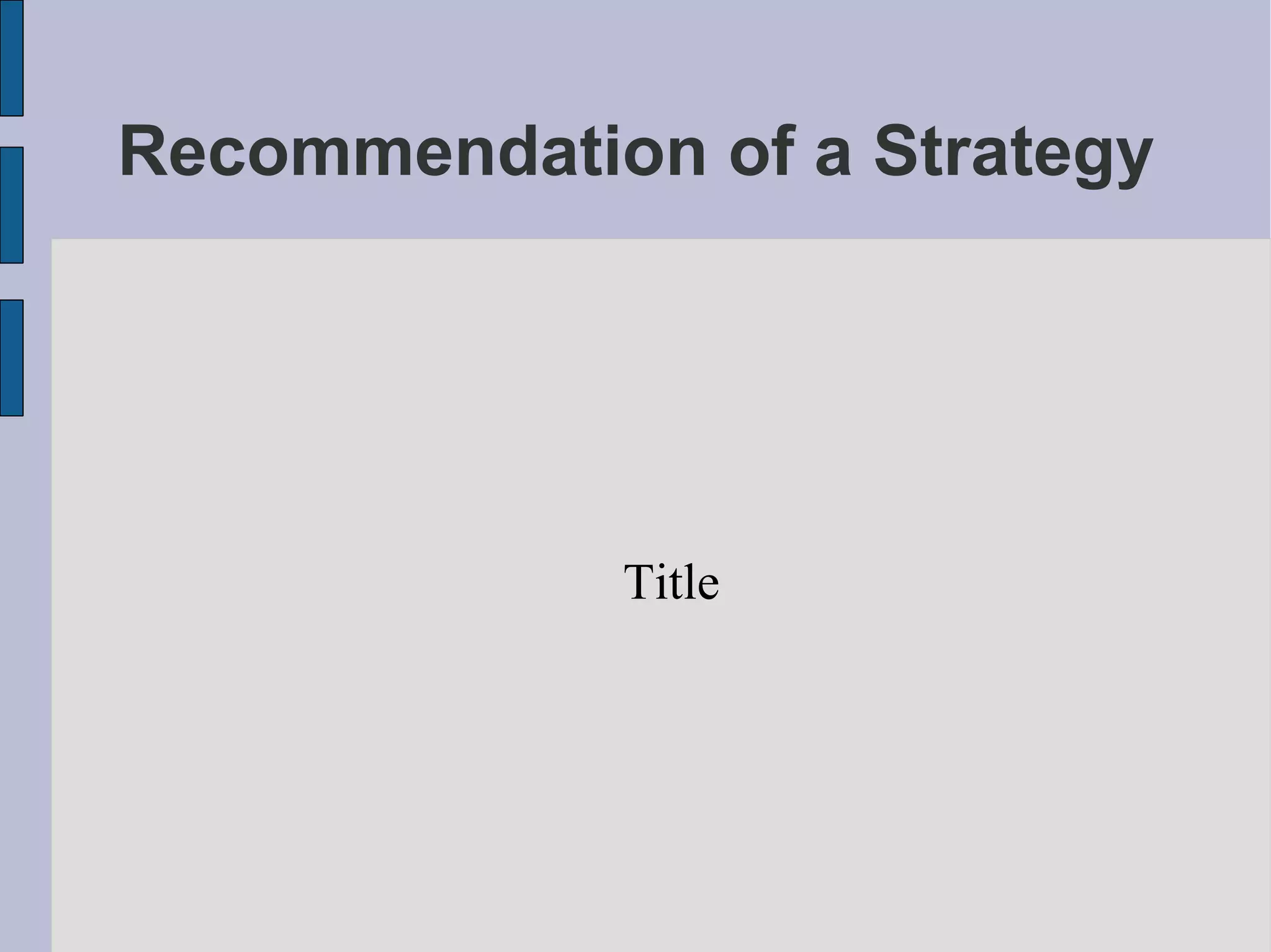 This document outlines a strategy recommendation template that includes summarizing current and past situations, stating long term goals, listing potential alternative strategies with their pros and cons, and recommending one or more strategies along with expected results and next steps. The template suggests summarizing main plans and long term courses of action, defining goals, recapping development and forecasts, listing alternative strategies and forecasting their costs, and delegating tasks to implement recommendations.