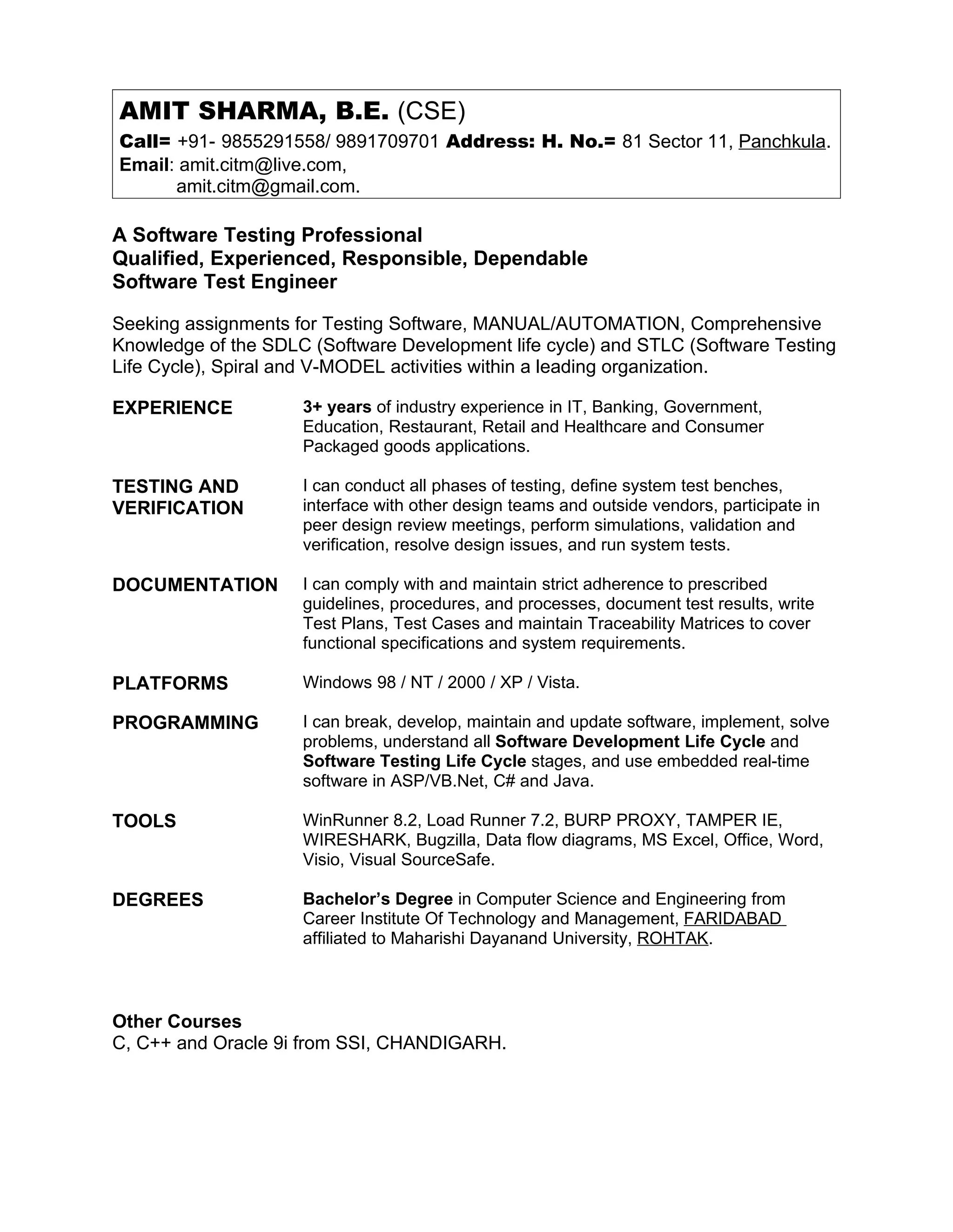 This document provides a summary of Amit Sharma's qualifications and experience as a software testing professional. It includes contact information, a summary of his 3+ years of experience in testing software applications in various industries, descriptions of the types of testing he can perform and tools he is proficient in, details on projects he has worked on, and his educational background which includes a Bachelor's degree in Computer Science and Engineering.