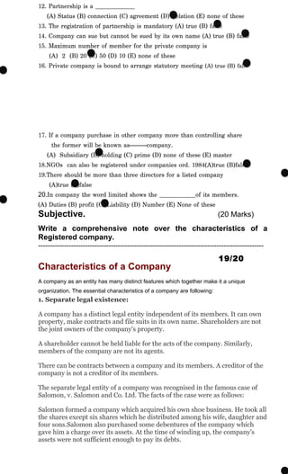 The subjective question asks to provide a comprehensive note on the characteristics of a registered company. The response lists 10 key characteristics: 1) Separate legal existence, 2) Perpetual succession, 3) Limited liability, 4) Transferability of shares, 5) Common seal, 6) Separation of ownership and control, 7) Voluntary association, 8) Artificial legal person, 9) Corporate finance, and 10) Statutory regulation and control. The response provides details and examples for each characteristic.