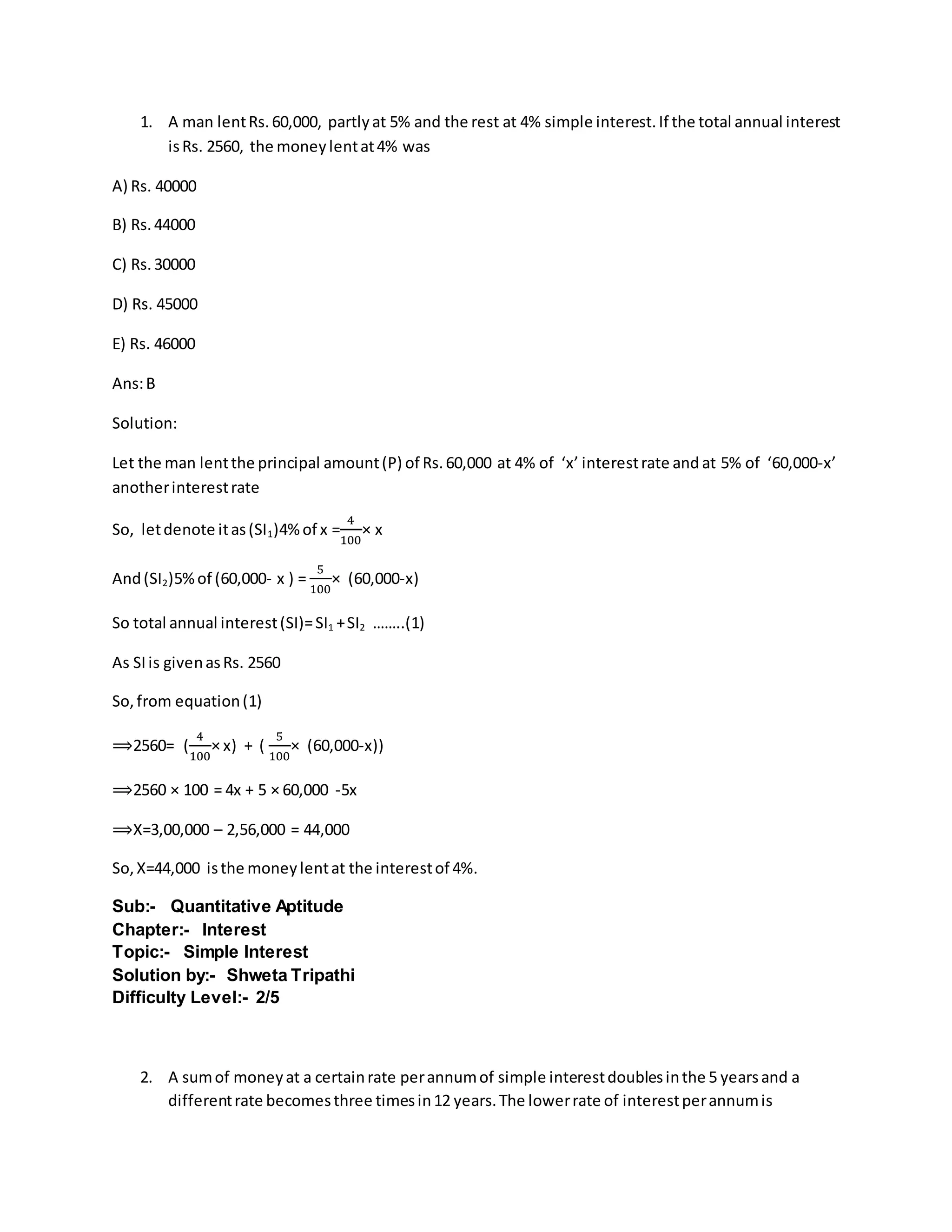 2. Detailed step-by-step solutions are provided for each problem showing the calculations and logic to arrive at the answer. Common concepts used include simple interest formula, doubling and tripling of principal over time based on given interest rates.