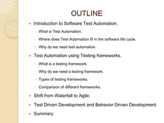 The document provides an overview of software test automation and testing frameworks. It discusses: