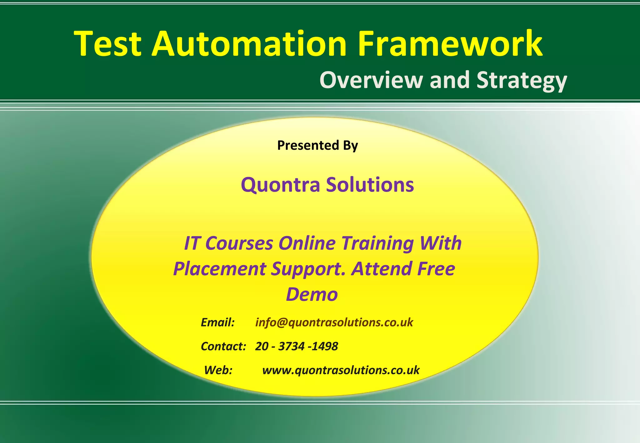 The document provides an overview of test automation frameworks and strategies, emphasizing the importance of treating automated testing as a software development process. It discusses various automation framework approaches, including data-driven, keyword-driven, and hybrid frameworks, along with guidelines for effective design and implementation. Key points highlight the need for a robust architecture, maintainability, and proper organization of tests to ensure successful automation.