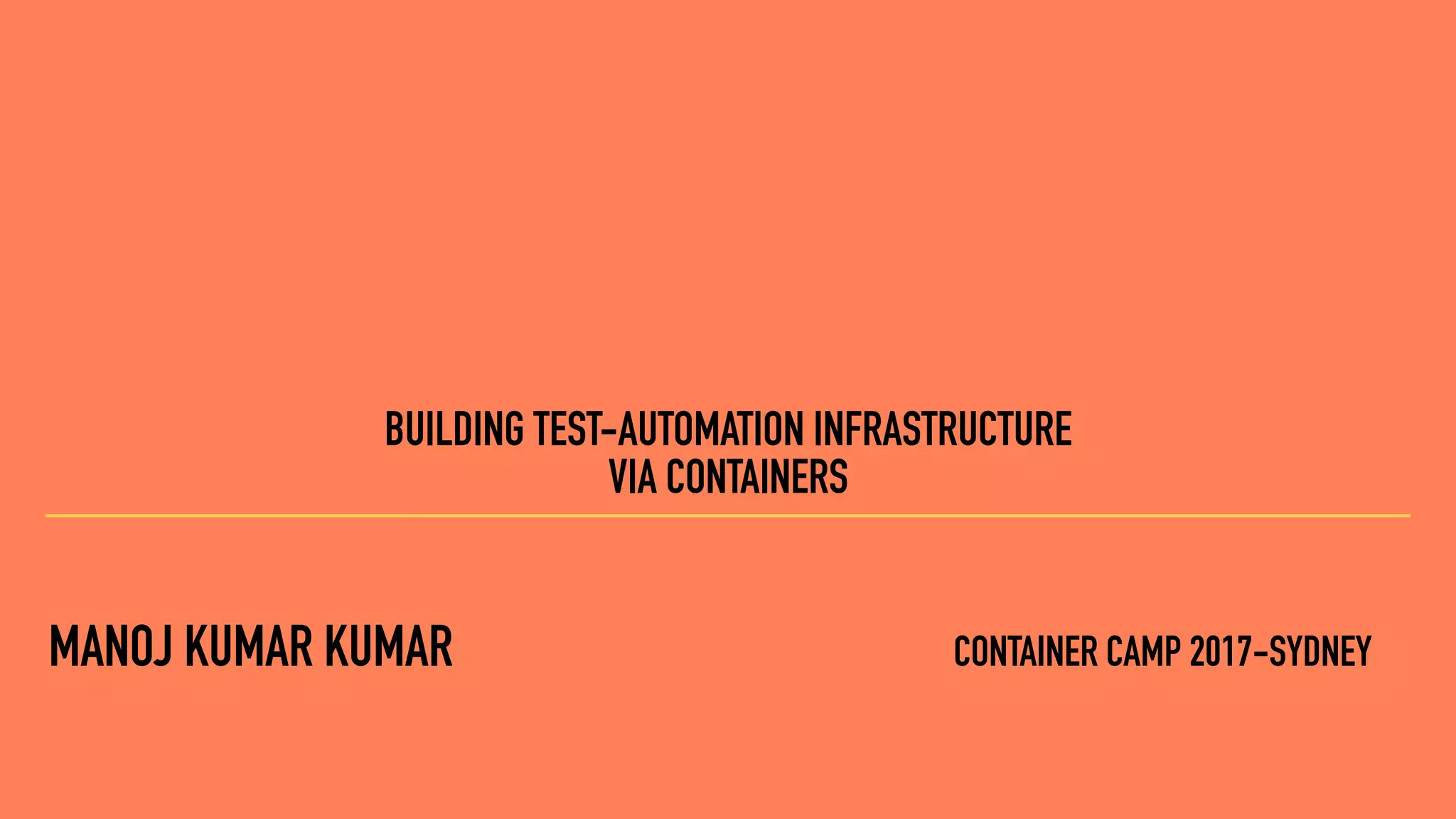 Manoj Kumar Kumar will discuss building test automation infrastructure using containers. He will cover continuous delivery, Selenium as a browser automation library, and using Selenium Grid to distribute tests across multiple browser instances. He will then discuss how using Docker containers can help address challenges with scaling tests and reduce costs compared to virtual machines. Manoj will demonstrate how to use the docker-selenium image to run a Selenium Grid hub and nodes within Docker containers.