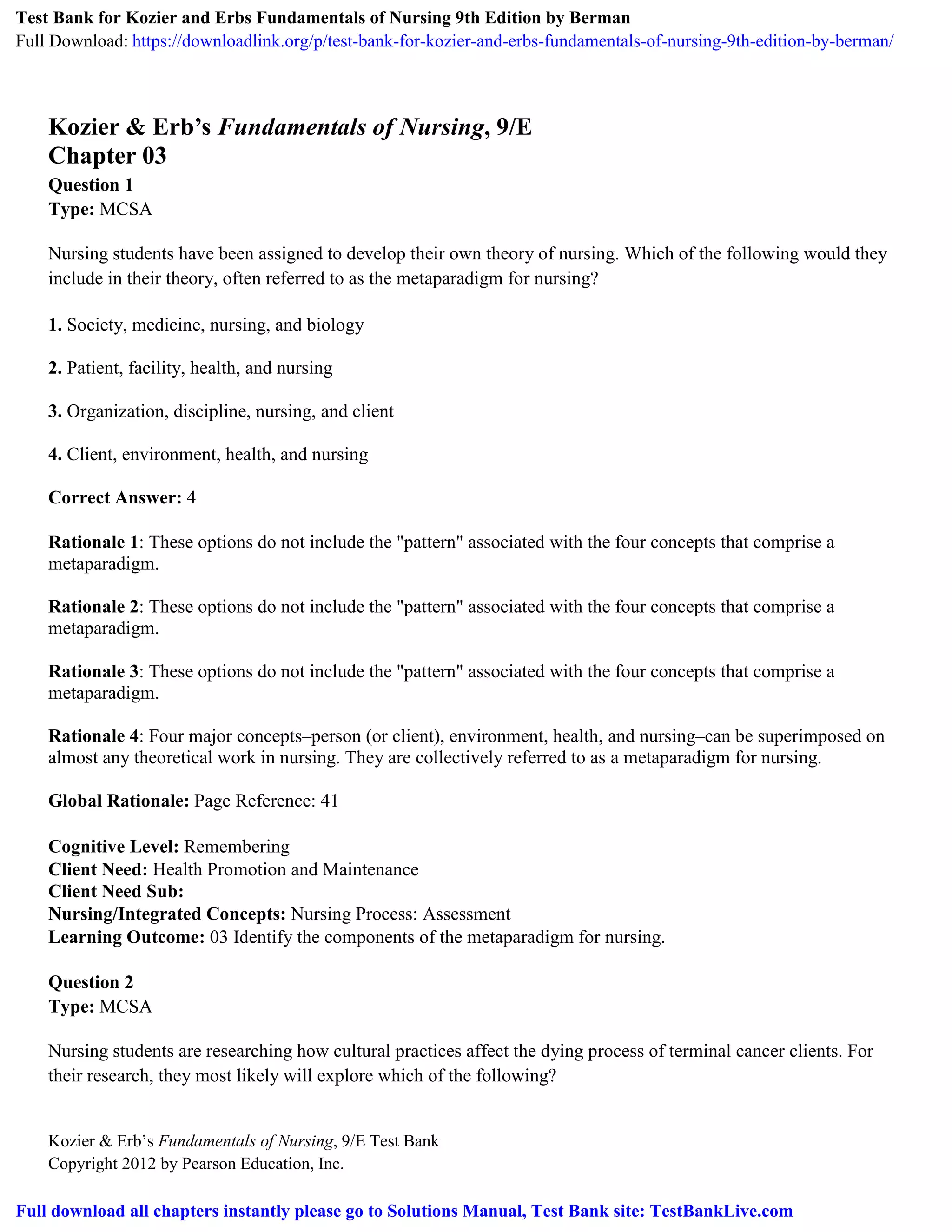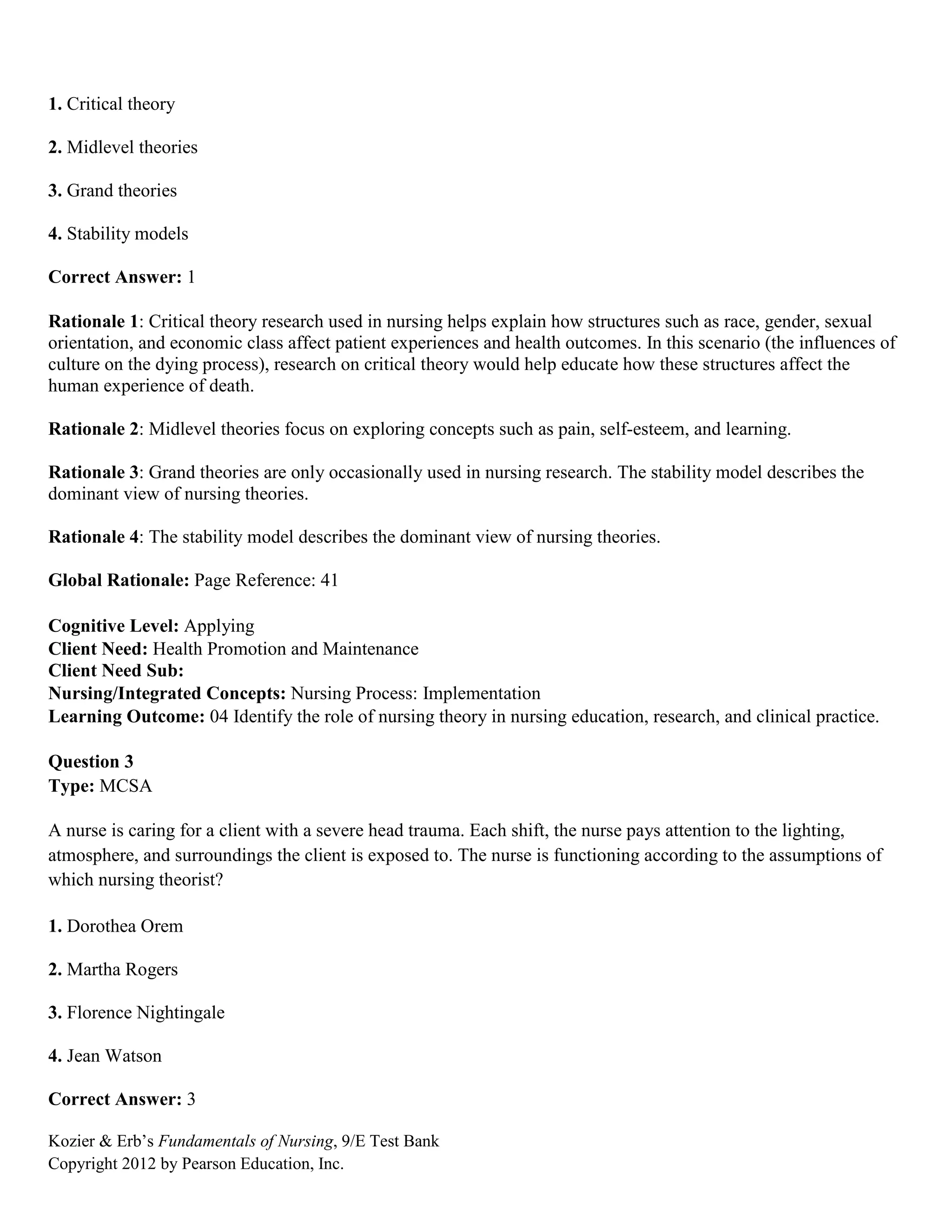 The document is a test bank for 'Kozier & Erb's Fundamentals of Nursing' containing multiple-choice questions (MCQs) related to nursing theories and their applications. Key topics include the metaparadigm of nursing, the influence of critical theory on nursing research, various nursing theorists such as Florence Nightingale and Hildegard Peplau, and the application of nursing theories in clinical practice. Each question includes correct answers and rationales to aid nursing students' understanding and application of theoretical concepts in nursing.