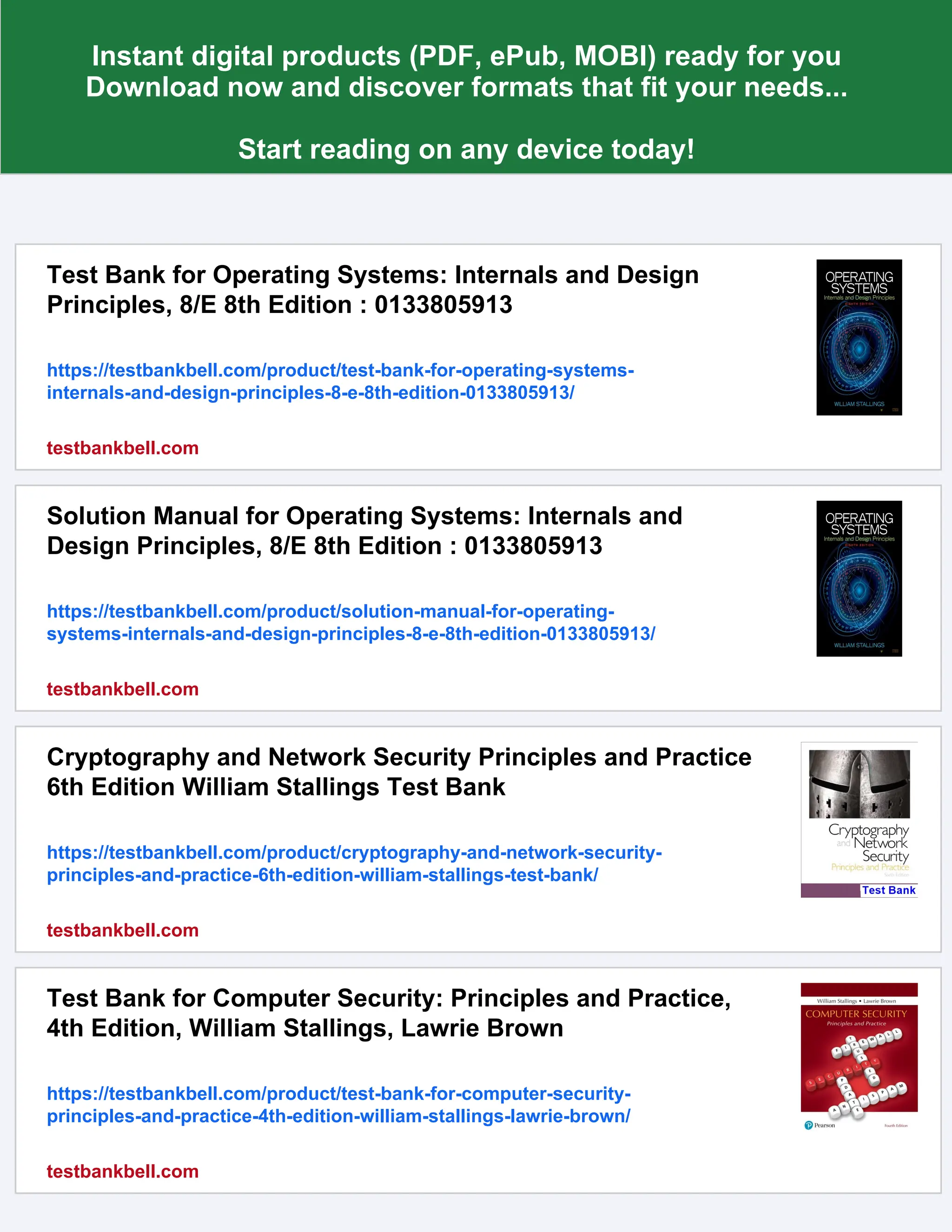 Instant digital products(PDF, ePub, MOBI) ready for you Download now and discover formats that fit your needs... Start reading on any device today! Test Bank for Operating Systems: Internals and Design Principles, 8/E 8th Edition : 0133805913 https://testbankbell.com/product/test-bank-for-operating-systems- internals-and-design-principles-8-e-8th-edition-0133805913/ testbankbell.com Solution Manual for Operating Systems: Internals and Design Principles, 8/E 8th Edition : 0133805913 https://testbankbell.com/product/solution-manual-for-operating- systems-internals-and-design-principles-8-e-8th-edition-0133805913/ testbankbell.com Cryptography and Network Security Principles and Practice 6th Edition William Stallings Test Bank https://testbankbell.com/product/cryptography-and-network-security- principles-and-practice-6th-edition-william-stallings-test-bank/ testbankbell.com Test Bank for Computer Security: Principles and Practice, 4th Edition, William Stallings, Lawrie Brown https://testbankbell.com/product/test-bank-for-computer-security- principles-and-practice-4th-edition-william-stallings-lawrie-brown/ testbankbell.com