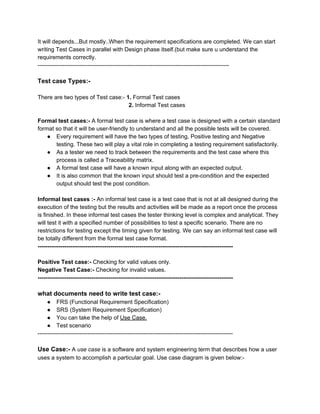 The document discusses the importance of writing test cases for software testing, detailing their purpose in tracking test coverage, maintaining consistency, and enabling reusability. It outlines when to start writing test cases, the types of test cases (formal and informal), and the difference between test cases and test scenarios. Additionally, it provides examples of test cases for specific objects such as pens and login buttons, illustrating various testing approaches.