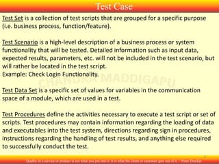 A test case is a set of conditions or variables under which a tester will determine whether a software system is working correctly. Test cases are often written as test scripts and collected into test suites. Characteristics of good test cases include being simple, clear, concise, complete, non-redundant, and having a reasonable probability of catching errors. Test cases should be developed to verify specific requirements or designs and include both positive and negative cases.