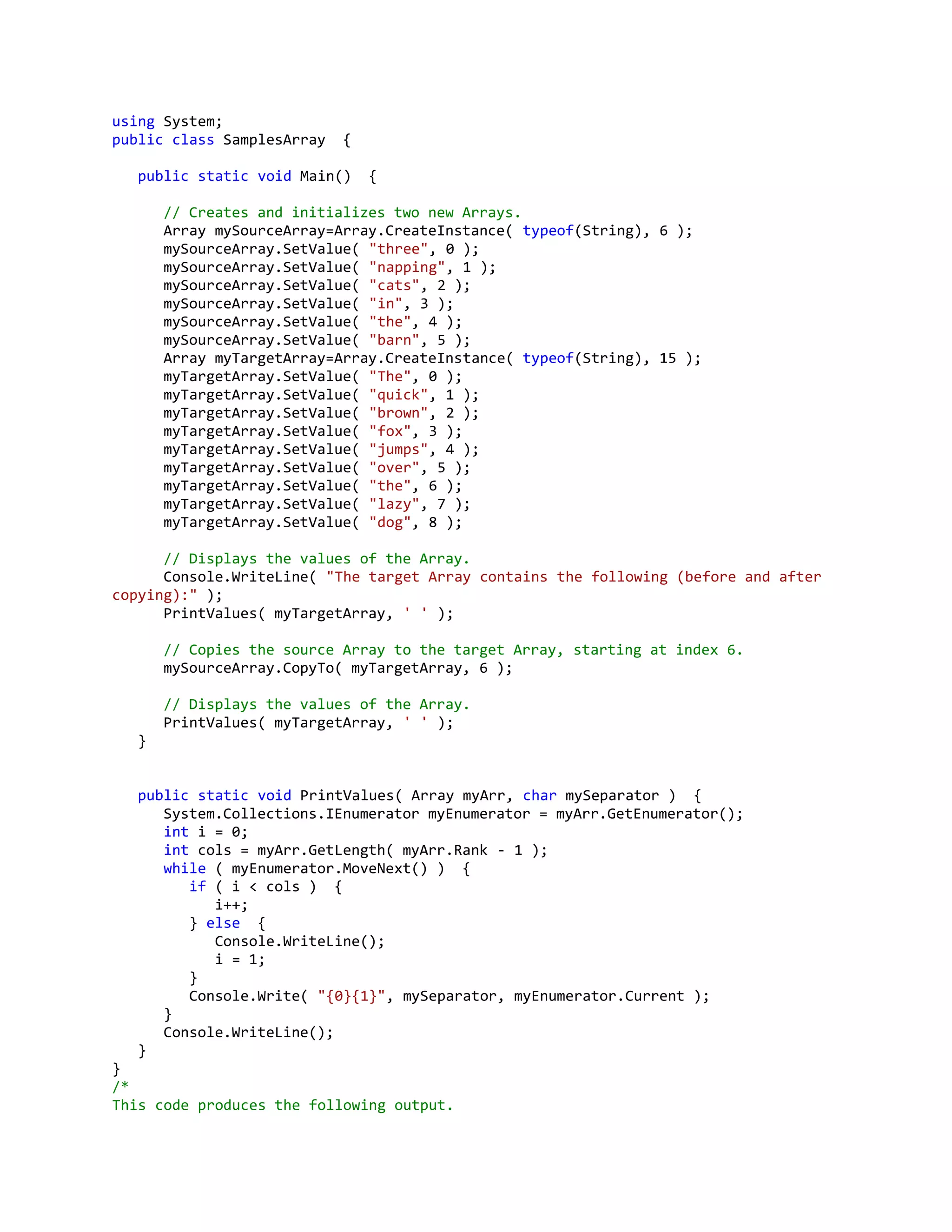 The document declares two string arrays, mySourceArray and myTargetArray, and initializes them with different string values. It prints the initial values of myTargetArray, then copies the values of mySourceArray into myTargetArray starting from index 6. It prints the updated values of myTargetArray to show the copied values have been inserted.