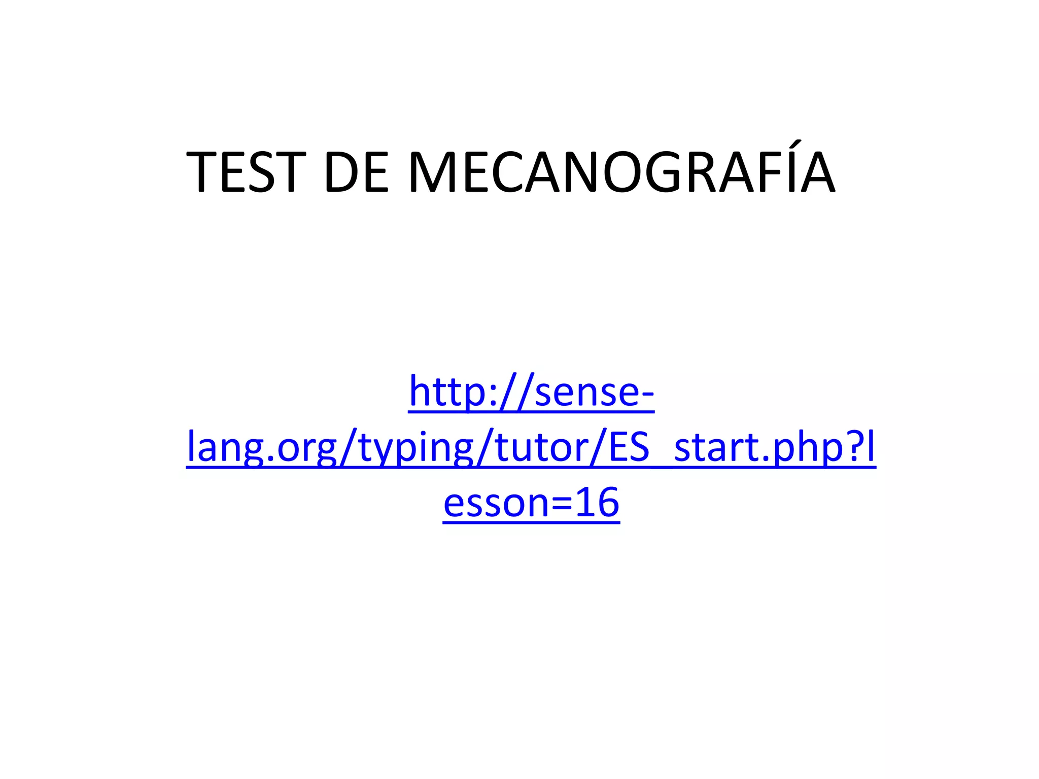 This document is a Spanish typing test from an online typing tutor. It provides a short practice text in Spanish for students to type in order to practice and improve their typing skills. The typing test measures speed and accuracy and tracks improvement over time as students repeat the tests.