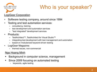 The document discusses action-based testing methodology and its importance in software testing and automation. It emphasizes the use of test modules for better organization and design, highlighting success factors and strategies to improve test quality and manageability. The document outlines approaches to design tests and specify objectives, advocating for clear scopes and communication among stakeholders to enhance automation success.