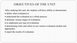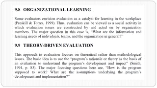 This document discusses different models of evaluation, including the four-level model, utilization-focused evaluation, and expertise/accreditation approaches. The four-level model includes responsive evaluation, goal-free evaluation, adversary/judicial approaches, and consumer-oriented approaches. Utilization-focused evaluation is based on the principle that an evaluation should be judged on its usefulness to intended users by engaging them in the process. Expertise/accreditation approaches rely on professional expertise to evaluate institutions, programs, products, and activities through formal review systems, informal reviews, or ad hoc panel and individual reviews.