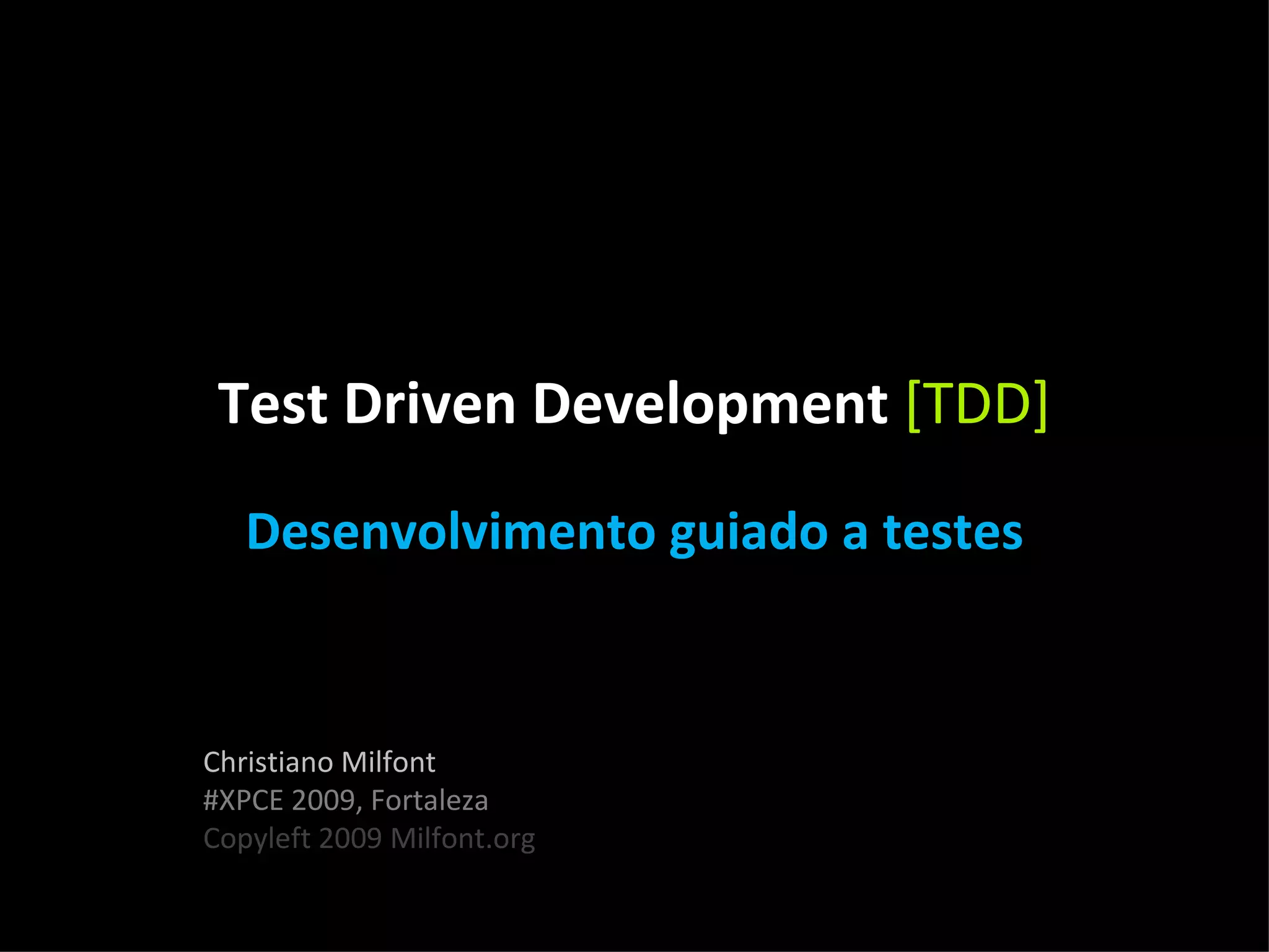 Test Driven Development (TDD) is a software development process that relies on the repetition of a very short development cycle: requirements are turned into very specific test cases that are failed, then code is written to pass the tests, and finally the new code is refactored if needed. This process allows software to be developed incrementally while facilitating change by providing continuous feedback. The document provides details on TDD patterns and processes like red-green-refactor cycles and using test doubles.